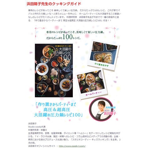 ■付属品:浜田陽子著「作り置きからパーティーまで 高圧&超高圧 大活躍の圧力鍋レシピ100」本・ 取扱説明書・蒸しす・掃除ピン