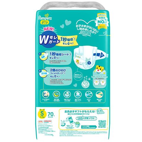 10年以上も病産院に選ばれてNo.1* 新改良パンパースさらさらケアテープは Wモレガード、モレ0へ!1秒吸収シート**!スポンジのように即吸収、お肌もさらさら!2倍のびのびフィットテープ**!動くたびに最大2倍**伸びるからぴったりフィット。背中のスキマも安心。最長12時間 一晩中の吸収力お肌にやさしい ふわふわ素材 ぴったり足まわりギャザー 独自! さらさら風通しライン オムツ *P&G社調査(パンパースシリーズの新生児用使用率データ)**平均尿量に基づく(P&G調べ)2回のおしっこを想定 ***伸ばす前との比較
