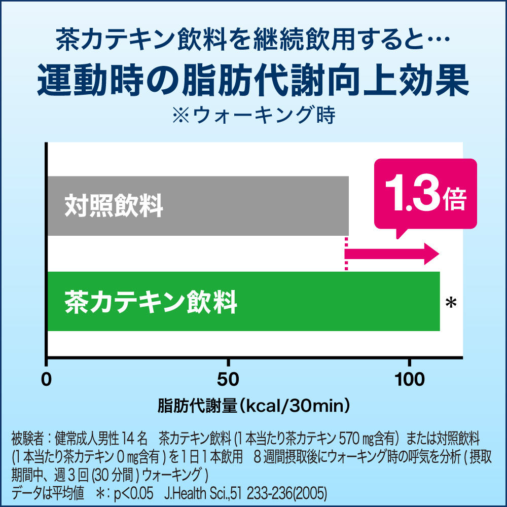 茶カテキン540mg配合。茶カテキンがもつキレ、控えめな甘さ、酸味の絶妙なバランスにより、ごくごく飲めて後切れも良い味わい。汗などで失われた水分やナトリウムの補給に大切な役割を果たす塩分や糖質の配合を最適に設計。ナトリウムは100ml中に53mg含有。一方、カロリーは普通のスポーツドリンクの約半分です(53kcal/1本当たり)。