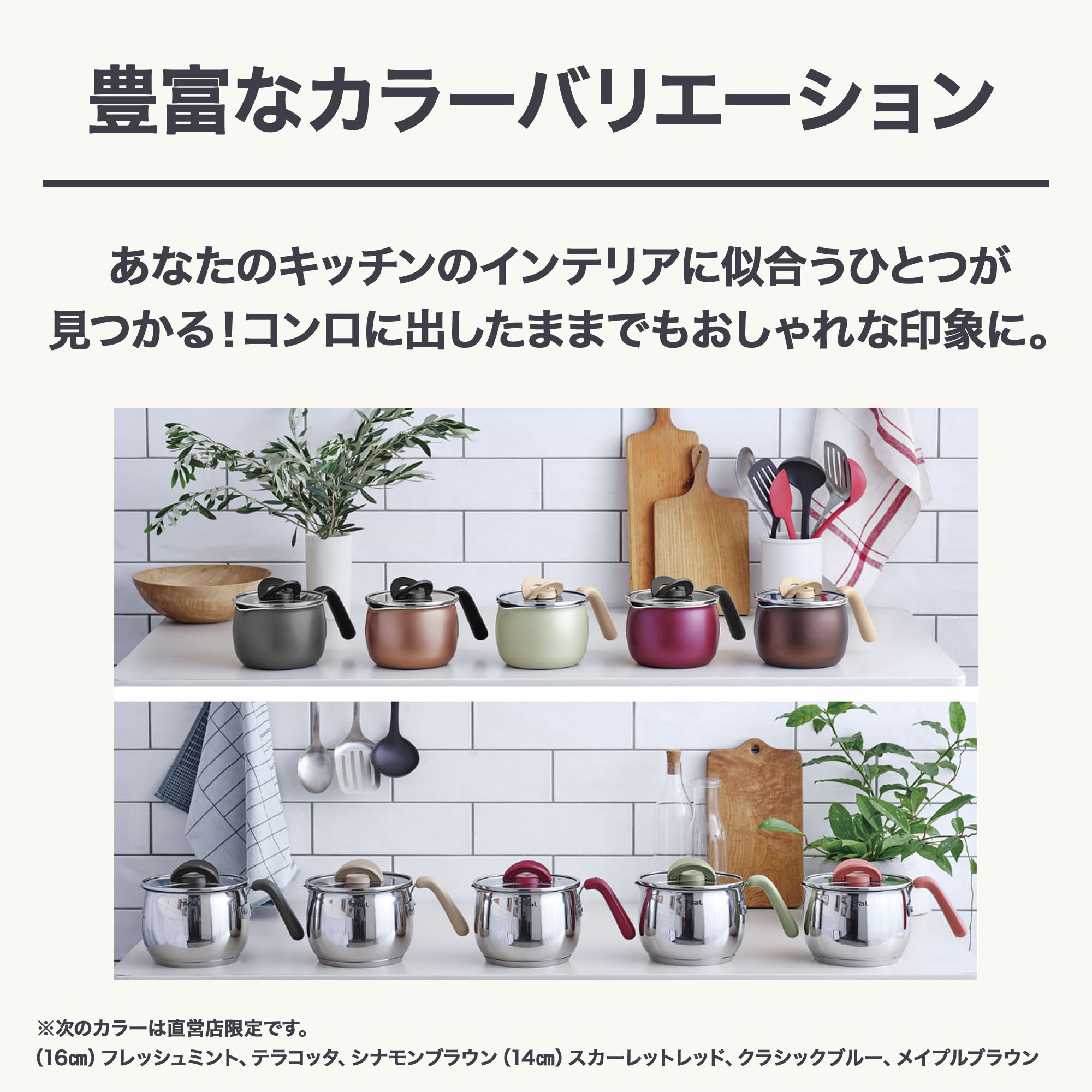 取っ手は握りやすいこだわり設計。角度がついているのでコンロの上で同時調理しても邪魔になりません。