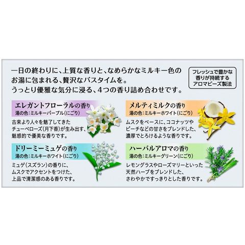 一日の終わりに、上質な香りとミルキー色のお湯に包まれる、贅沢なバスタイムを。うっとり優雅な気分に浸る、4つの香り。(エレガントフローラル・ドリーミーミュゲ・メルティミルク・ハーバルアロマ)さら湯よりもっといたわるお湯質※に。塩素除去剤(アミノ酸)配合。素肌と同じ弱酸性の湯。「炭酸力」が温浴効果を高めて芯まで温めほぐす!短め入浴にも。疲労・肩こり・腰痛・冷え症に。【医薬部外品】※湯ざわり