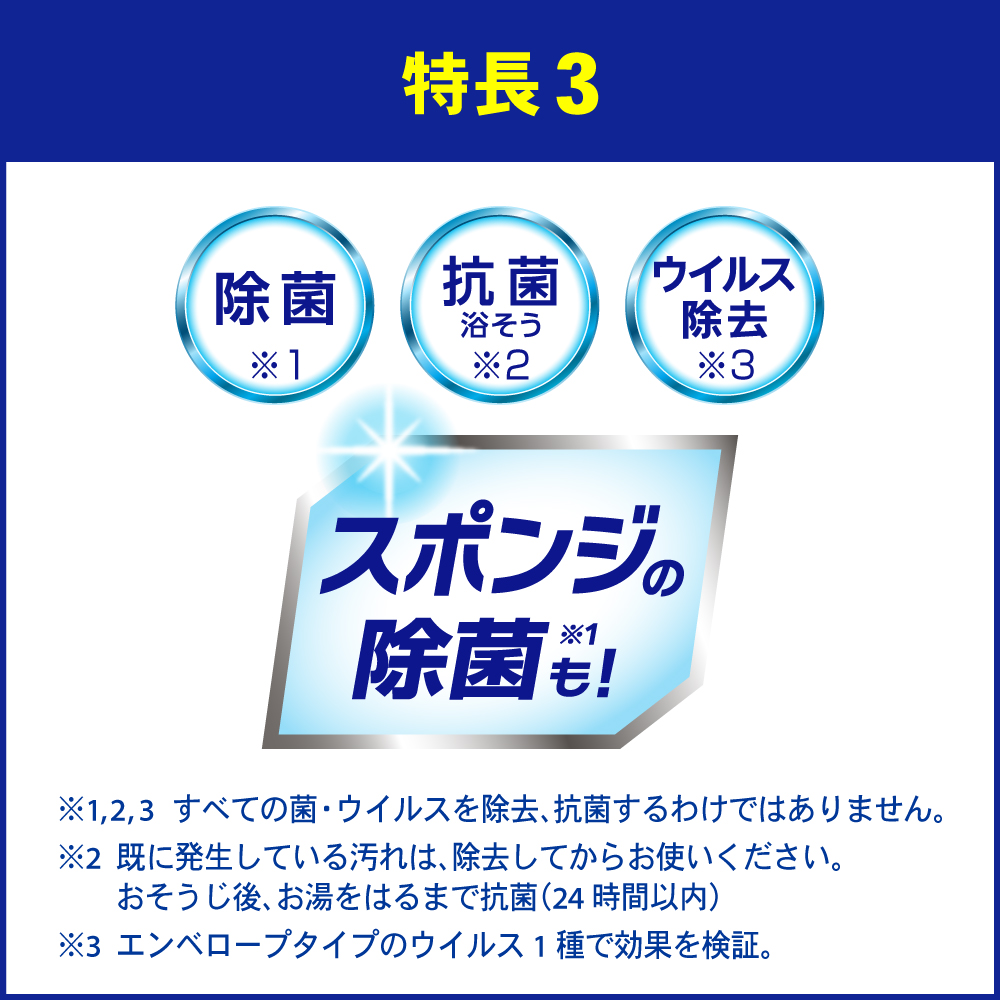 豊かな泡が湯アカや石鹸カスをしっかり落とすのはもちろん、菌に直接働きかけることで、菌由来のヌメリやピンク汚れ、黒カビの発生も防ぐ。