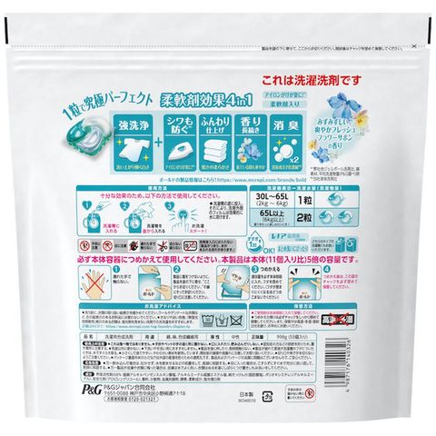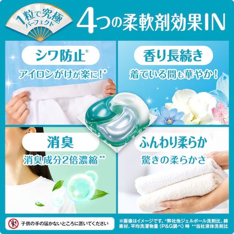 洗濯洗剤 1粒で究極パーフェクト 柔軟剤効果 4 in 1 レノア 超消臭 共同開発 みずみずしい♪爽やかフレッシュフラワーサボンの香り 通常の5倍!※強洗浄 洗い上がり輝く白さシワも防ぐ* アイロンがけが楽に!*ふんわり仕上げ 驚きの柔らかさ香り長続き 着ている間も華やか消臭成分2倍濃縮**すすぎ1回OK!まとめ洗いにぴったり※ボールドジェルボール本体(11個入り)対比 *P&G社他ジェルボール洗剤比、綿素材、平均洗濯物量(P&G調べ)時 **P&G社液体洗剤比