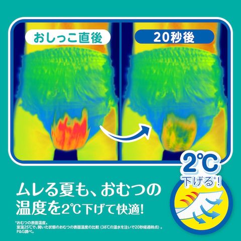 パンパースさらさら風通しパンツおむつは、クールケアシステム(TM)で、熱気も湿気も素早く逃がすから、-2℃涼しく快適!蒸し暑い夏でもお肌さらさら。穴あき通気カバー 通気穴から湿気を外に逃がすから、 お肌さらさら1秒吸収*シート. スポンジのように即吸収、お肌さらさら。