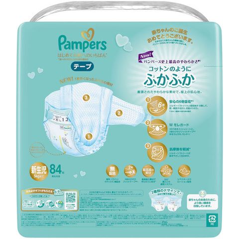 病産院に選ばれてNo.1^NeW! パンパース史上最高のやわらかさダブルレイヤー構造で、コットンのようにふかふか極上の肌心地安心の6倍吸収** シルキーソフトシートと吸収体が分散して、即・吸収するから、お肌さらさらW モレガード 3D穴あきメッシュシートと、2倍のびのびフィットテープ*** モレ0へ!肌摩擦を軽減* シルキーソフトシートが 肌をやさしく包みます香料 パラベン ラテックス 無配合2倍のびのびフィットテープ***最高級の素材で作られています* シアバター入り ローション配合