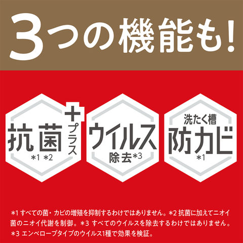 最高の清潔力。汚れ・ニオイをかくまう菌の隠れ家蓄積ゼロへ※1。菌の隠れ家除去※2成分最高レベル配合※3で、菌の隠れ家まで除去※2。「抗菌+(プラス)※4※5」「ウイルス除去※6」「洗たく槽の防カビ※4」