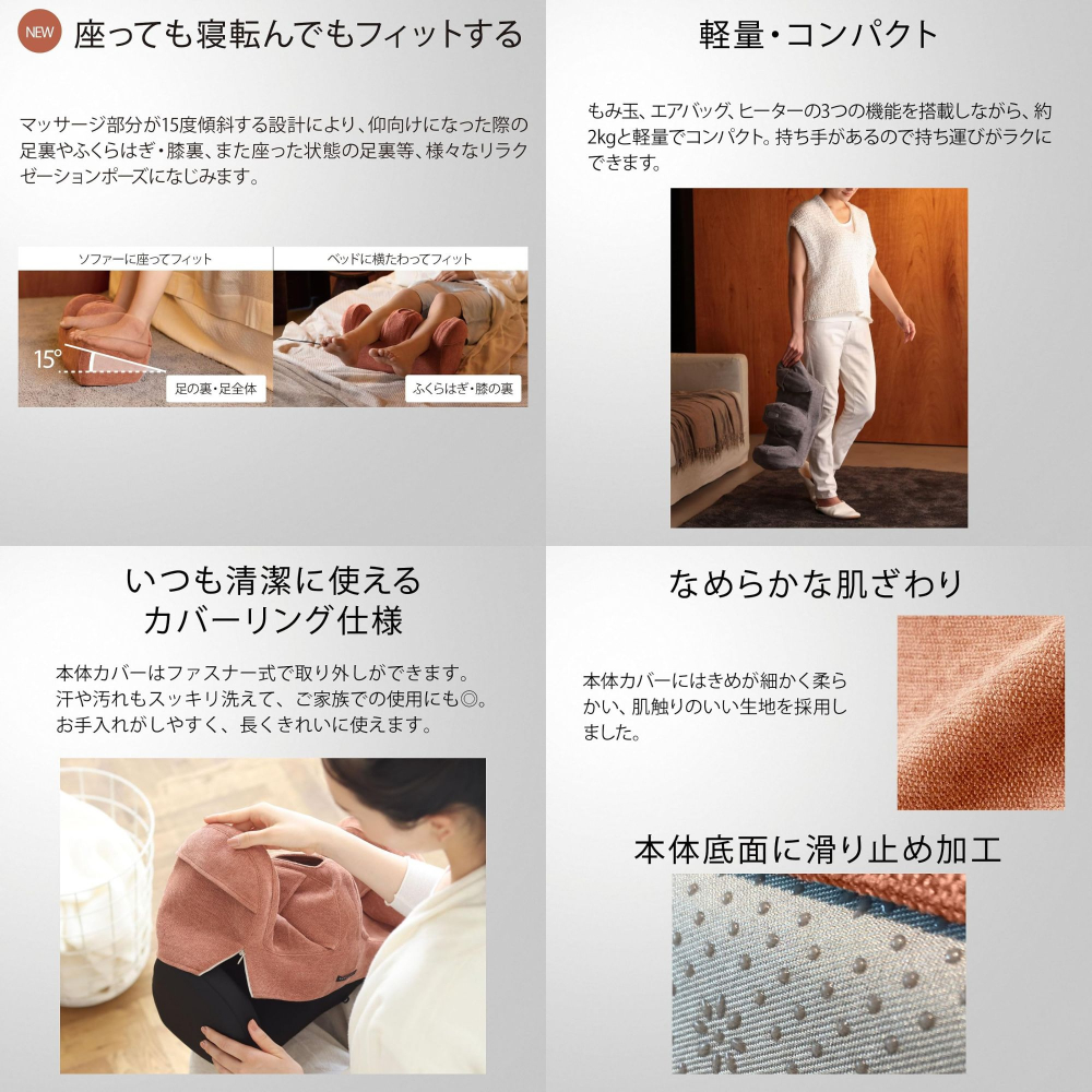 本体を樹脂からウレタンにすることで、もみ玉、エアバッグ、ヒーターの3つの機能を搭載しながら、約2kgと軽量です。