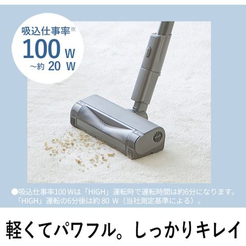 ★1 一般社団法人 日本電機工業会 充電式掃除機の自主基準試験方法による。使用時の吸塵力は吸込仕事率以外に吸込具の種類・ゴミのたまり具合や床材の違い等によって異なります。