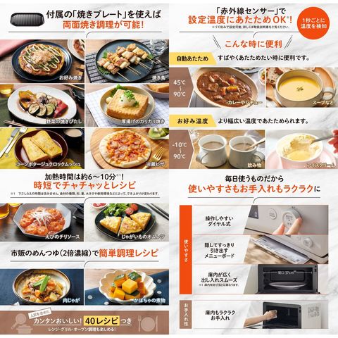 赤外線センサーが食材の温度を1秒ごとに検知するのでスープやごはん、調理済みのおかずなど、おいしい温度であたためられます。(自動メニューの調理・手動メニューの調理は除く)
