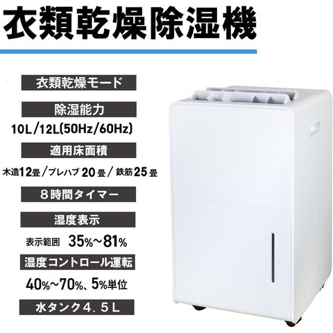 除湿量12L/日。4.5Lタンクで面倒な水捨て回数を軽減。5%単位で湿度設定。衣類乾燥モード搭載。除湿目安:木造住宅12畳/プレハブ住宅20畳/集合住宅25畳。