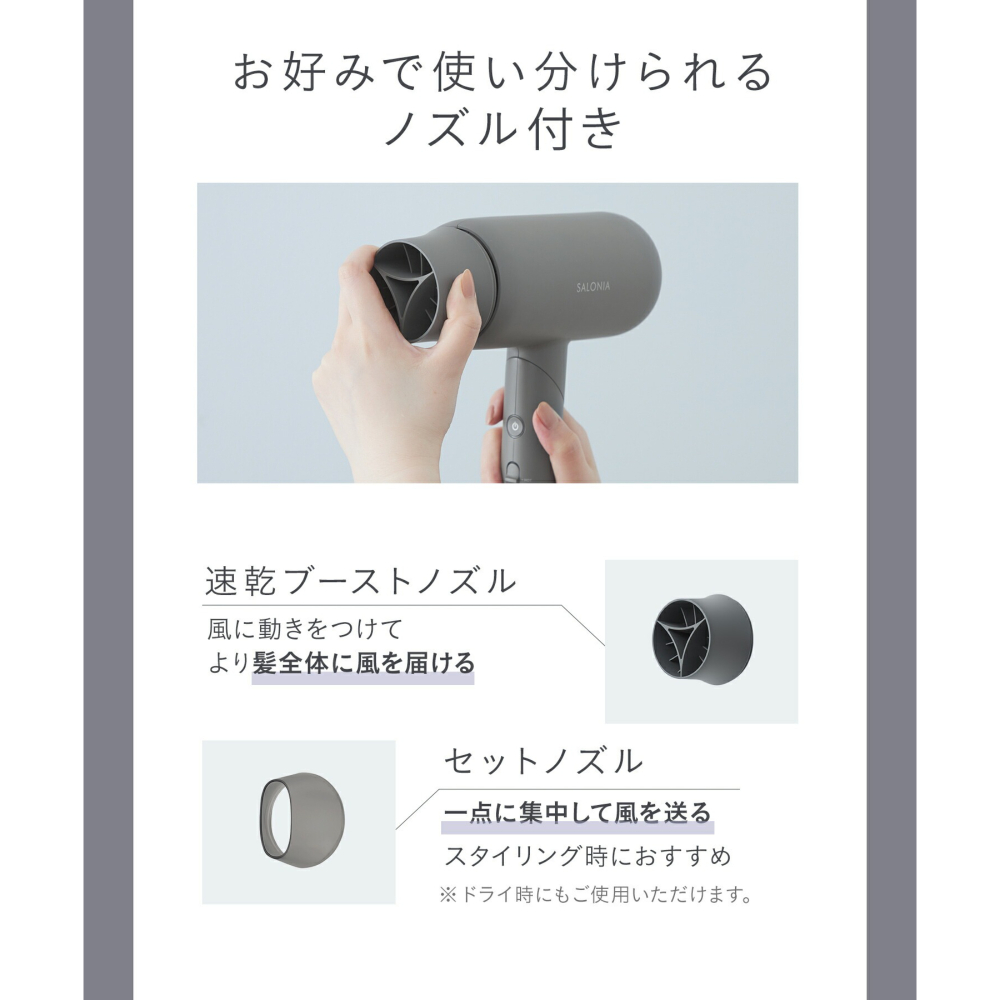 風に動きをつけてより髪全体に風を届ける「速乾ブーストノズル」と、スタイリングにおすすめの「セットノズル」の選べる2種類のノズルで、用途に合わせて使い分けることができます。