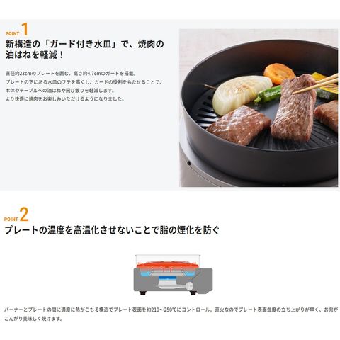 直径約23cmのプレートを囲む、高さ約4.7cmのガードを搭載。プレートの下にある水皿のフチを高くし、ガードの役割をもたせることで、本体やテーブルへの油はねや飛び散りを軽減します。より快適に焼肉をお楽しみいただけるようになりました。