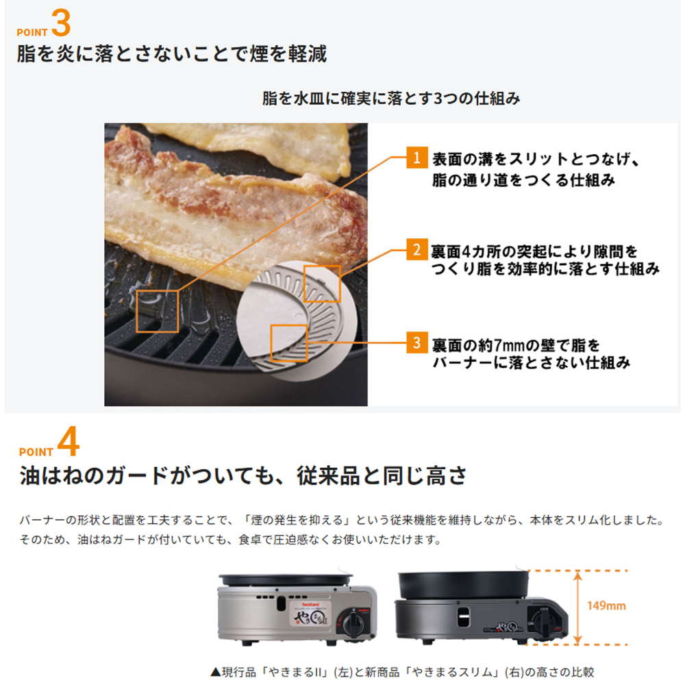 バーナーの形状と配置を工夫することで、「煙の発生を抑える」という従来機能を維持しながら、本体をスリム化しました。そのため、油はねガードが付いていても、食卓で圧迫感なくお使いいただけます。