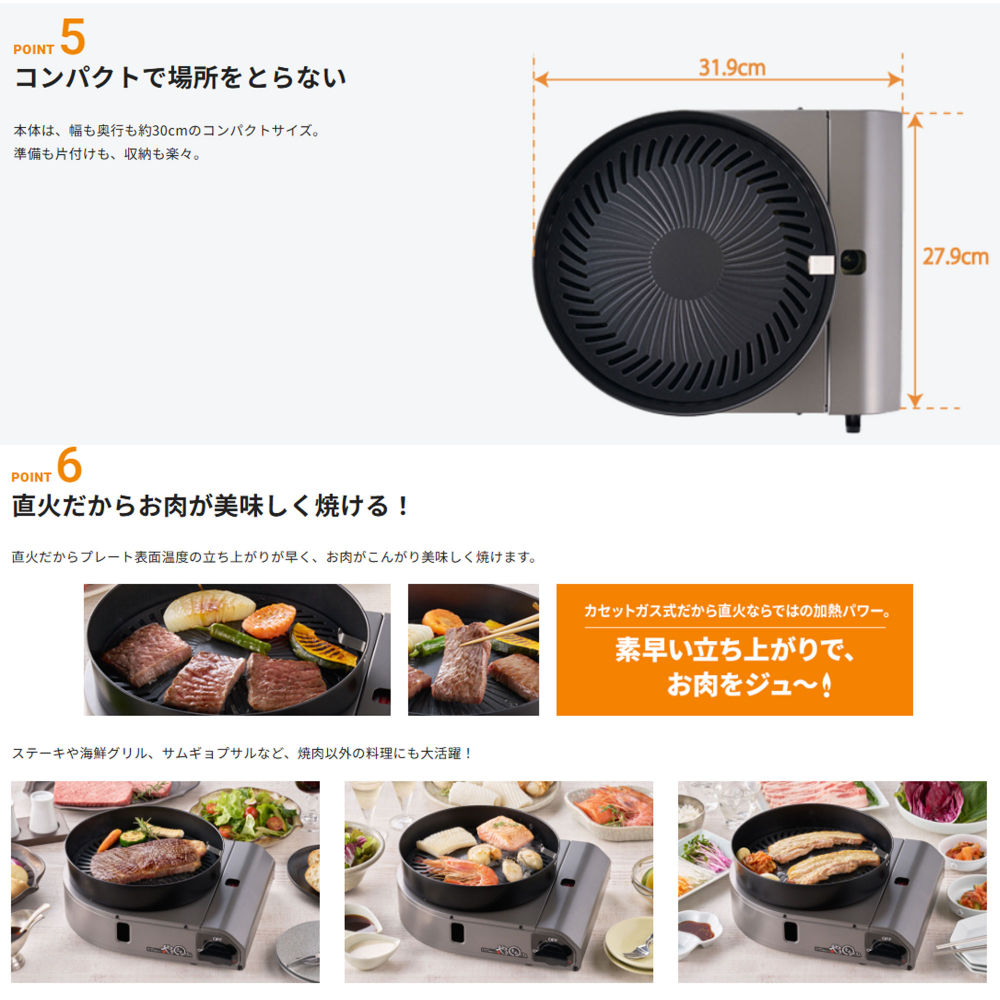 直火だからプレート表面温度の立ち上がりが早く、お肉がこんがり美味しく焼けます。