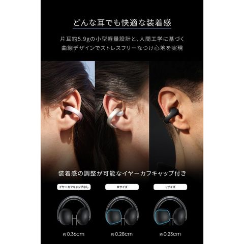 片耳約5.9gの小型軽量設計と、人間工学に基づく曲線デザインでストレスフリーなつけ心地を実現。装着感の調整が可能なイヤーカフキャップ付き。