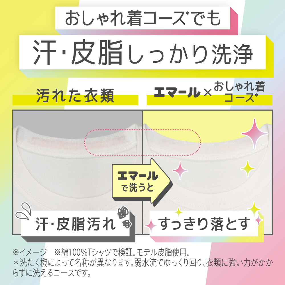 ハリ感チャージ成分2倍配合!ヘビロテTシャツ・ニットも洗うたびシワ・カタチ回復!お気に入り服がキレイに長く着られる、洗たく用洗剤(おしゃれ着用)。