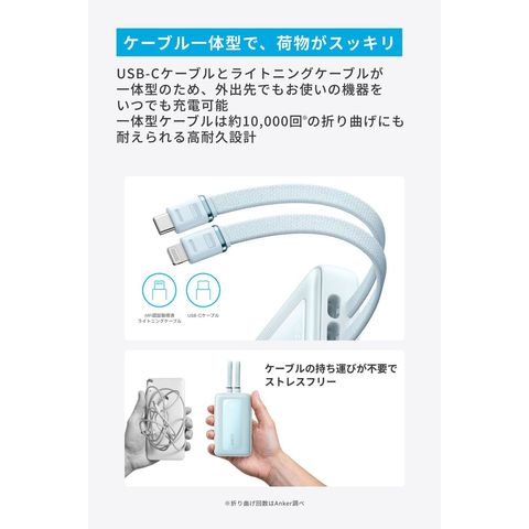 約10000回の折り曲げにも耐えられる高耐久設計のケーブル一体型のため、別途ケーブルの持ち運びが不要