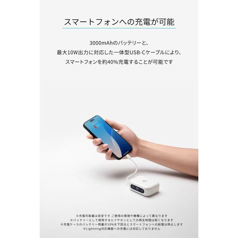- ノイズキャンセリングモード:最大10時間(イヤホン本体のみ) / 最大160時間(充電ケース使用時)