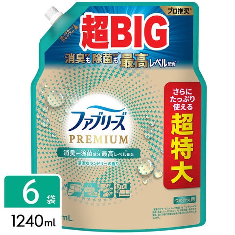 P&G ファブリーズ 消臭スプレー PREMIUM 消臭+除菌成分最高レベル配合 衣類・布製品用消臭剤 清潔なランドリーの香り 詰め替え 超特大 1240mL×6袋 4987176301543