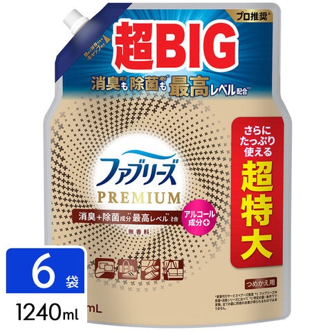 P&G ファブリーズ 消臭スプレー PREMIUM 消臭+除菌成分最高レベル配合 衣類・布製品用消臭剤 アルコール成分+ 無香料 詰め替え 超特大 1240mL×6袋 4987176301680