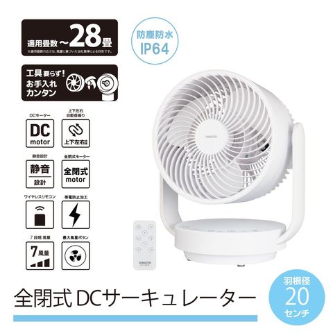 山善 20cm DCサーキュレーター 全閉式モーター 防塵防水 帯電防止 上下左右首振り 全分解 コード長2.4m ホワイト YAR-RD20T-W