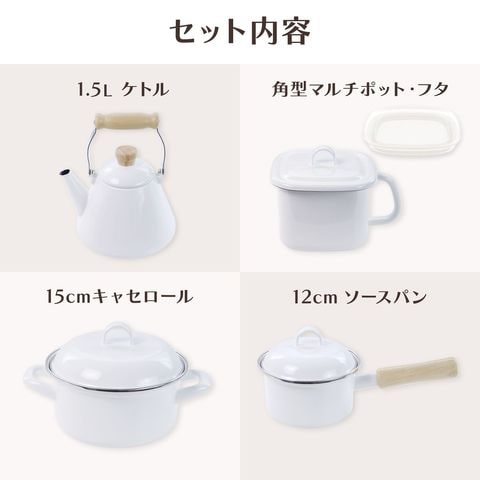 富士ホーロー 【最短翌日配送】 2026年限定 福袋 ホーローSimple(シンプル)4点セット ホワイト 12cmソースパン・15cmキャセロール・マルチポット・フタ・1.5Lケトル OT26-100.W