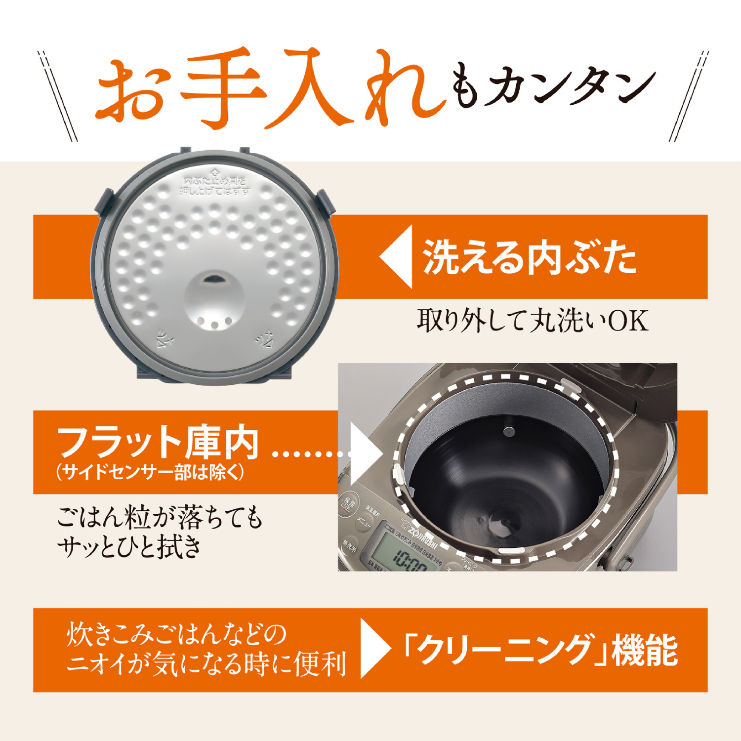 ※ IH炊飯ジャーは強い火力で炊飯するため、炊飯中に「ブーン」という冷却ファンが回る音がします。また、炊飯中や保温中に「ジー」という音がしますが、マイコンが火力を調整している音です。故障ではありませんので安心してお使いください。