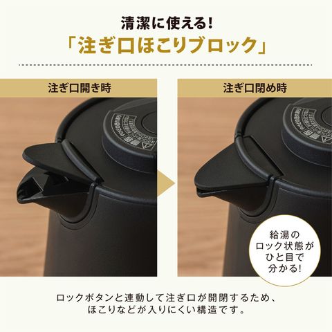 ロックボタンと連動しており、使わないときは注ぎ口にほこりが入りにくい構造で清潔にご使用いただけます