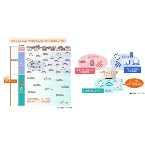 「Wi-Fi6E(11ax)」はWi-Fi6の拡張版として登場した通信規格で、従来の5GHz帯/2.4GHz帯に6GHz帯を加えたトライバンド(3帯域)を利用できます。