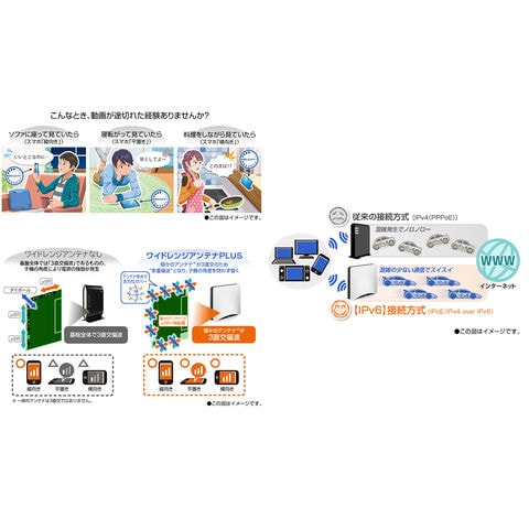 WX11000T12では、6GHz帯と5GHz帯ともに従来の5GHz帯(11ac)4ストリーム機の約2.7倍となる最大4804Mbpsの高速通信が可能。また、2.4GHz帯通信においても1147Mbpsの通信性能を備えています。