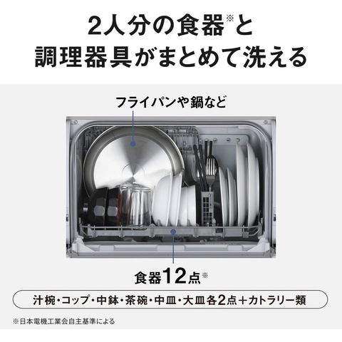 さらに、フラットにたためる上かごにより、2人分の食器(日本電機工業会自主基準による)と調理器具がまとめて洗えます。