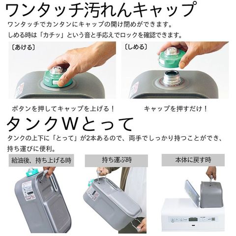 タンク容量は**9.0 L**で、給油回数を減らすことができます。給油時に手が汚れにくい「ワンタッチ汚れんキャップ」を採用しており、ボタンを押すだけでキャップの開け閉めが簡単に行えます。また、「タンクWとって」により、タンクの上下に取っ手があるため、両手でしっかり持てて持ち運びが容易です。給油が必要な際は、メロディーとモニターの点滅で2回に分けて知らせる「給油モニター(給油サイン)」機能があります。