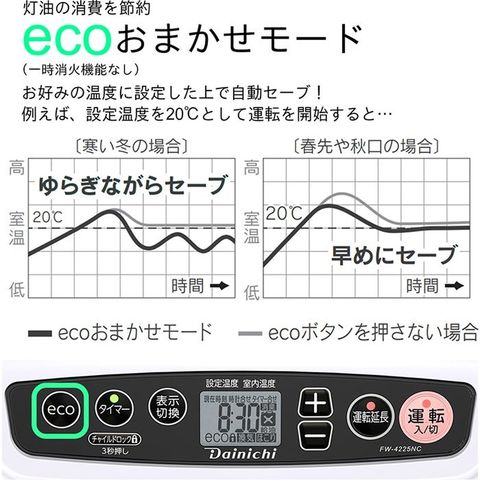 エコ機能「ecoおまかせモード」を搭載し、室温変化にあわせて燃焼量を自動でコントロールします。これにより、お好みの温度に設定した上で灯油の消費をセーブし、快適に節約運転ができます。