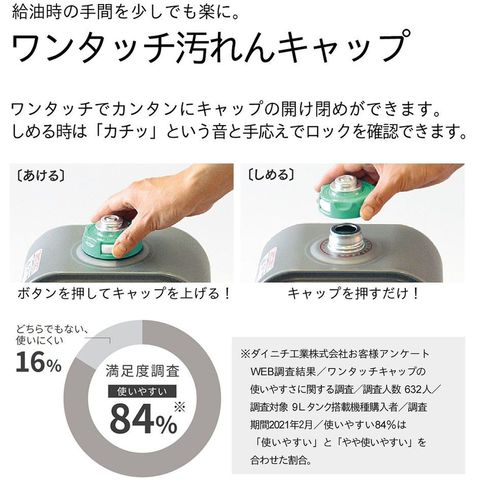 給油時に手が汚れにくい「ワンタッチ汚れんキャップ」を搭載しており、ボタンを押すだけで簡単にキャップの開け閉めができます。給油が必要な際は、「給油モニター(給油サイン)」が、電子音とモニターの点滅で2回に分けて知らせます。