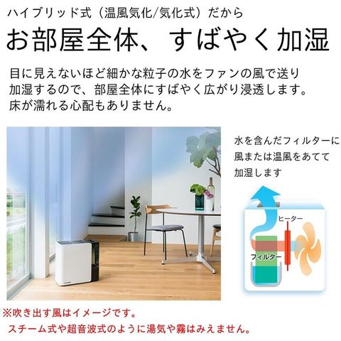 ダイニチのハイブリッド式加湿器は、湿度が低い時にヒーターを使う「温風気化式」でパワフルにすばやく加湿し、高湿度時には送風の「気化式」に切り替えることで省エネを実現します。