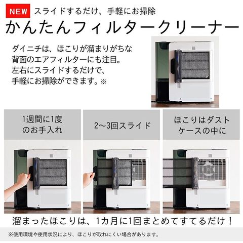 HD-LXC1000Dには、新たに**かんたんフィルタークリーナー**が搭載されています。これは、左右にスライドするだけで背面の抗菌エアフィルターを簡単にお掃除できる機能であり、ほこりが溜まったら1カ月に1回まとめて捨てるだけで済みます。こまめなお掃除により、ムダな電気の消費を少なくできます。