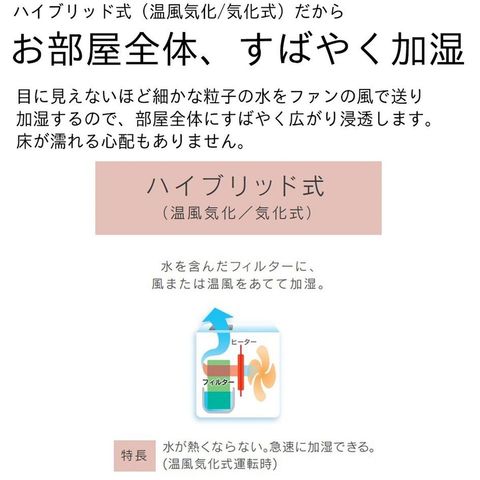 N TYPEはハイブリッド式(気化式と温風気化式の組み合わせ)を採用しており、湿度が低い時にヒーターでパワフルにすばやく加湿し、湿度に応じて運転方式を賢く使い分けることで省エネを実現します。