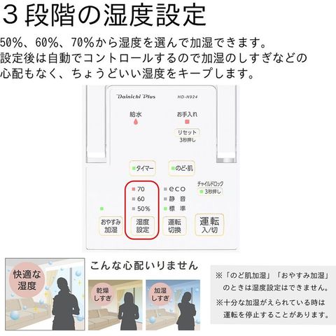 **「おやすみ加湿」**機能を搭載しており、ボタンを押すと、眠りにつくまでの最初の1時間は最小運転音**13 dB**で静かに運転します。その後は「静音」運転(50パーセント)に切り替わり、自動で加湿をコントロールします。