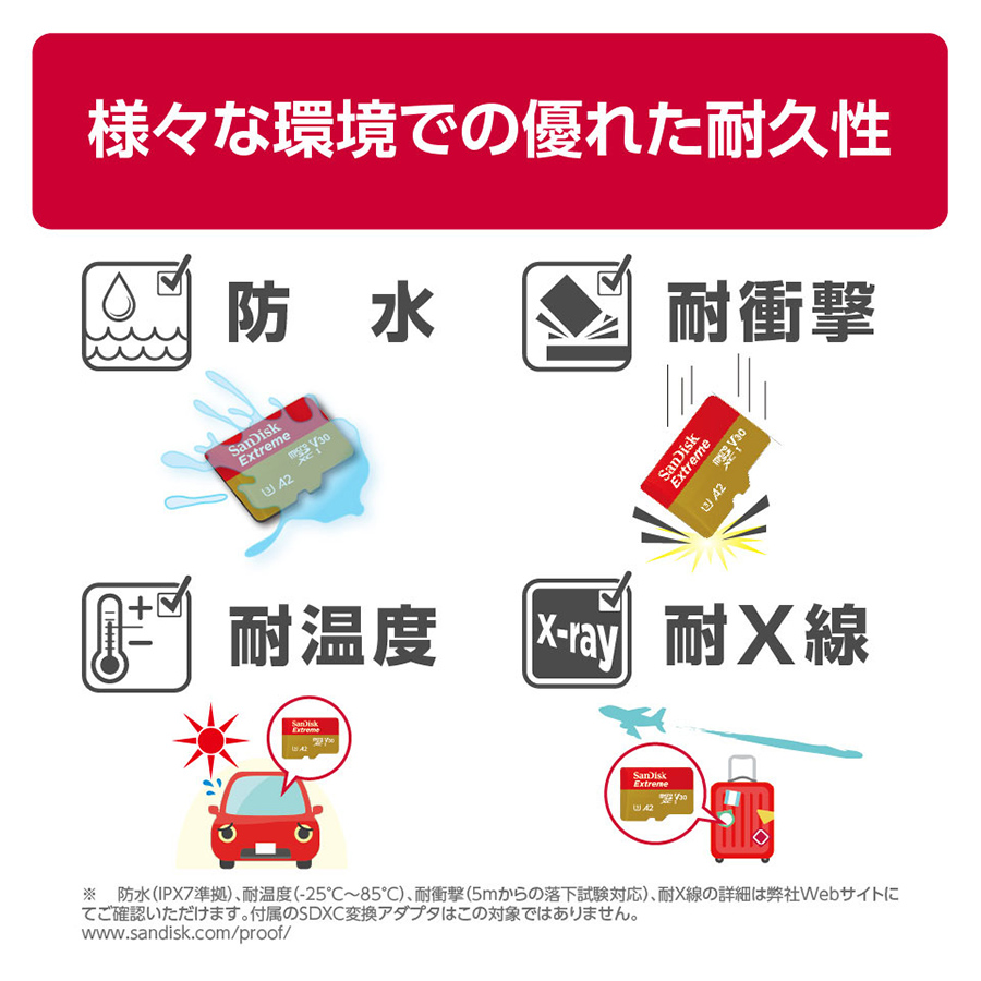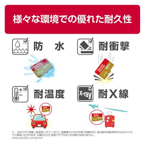耐温度、耐衝撃、耐X線などの耐久性を備えているので、様々な環境でお使いいただけます。防水仕様なので、万が一の水没からもデータを守ります。