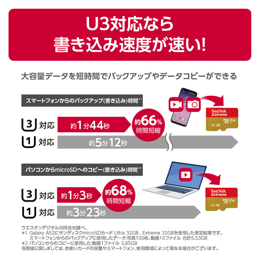 最大60MB/秒の高速な書き込み速度により、内部ストレージに保存された容量の多い4K動画などのコンテンツや、連射撮影後の大量の画像データも、素早くmicroSDに移動することができます。スマートフォンからのバックアップ、パソコンからのコピーもとても速く快適になります。