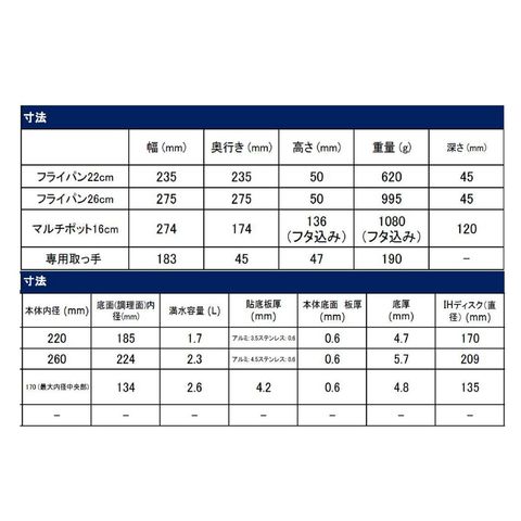 【フライパン22、26cm / 専用取っ手(マット・ブラック)】 / オプティスペースIH ステンレス マルチポット チャコールグレー 16cm