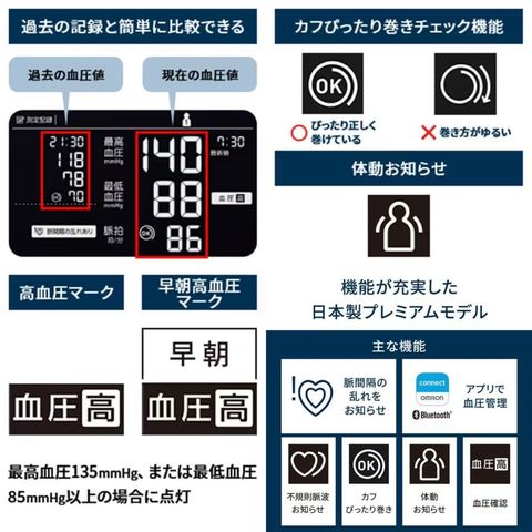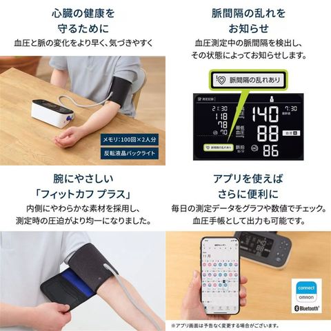 血圧測定時の不規則な脈のリズムを検知して、2種類の表示でお知らせします。測定中の脈の間隔が一部だけ不規則なときは「不規則脈波」、常に不規則で乱れているときは「脈間隔の乱れあり」と表示されます。