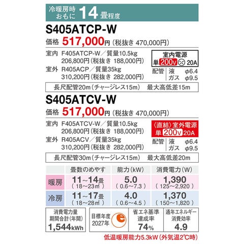 ダイキン エアコン CXシリーズ おもに14畳用/単相200V フィルター自動掃除 ストリーマ 2025年モデル 【配送のみ 設置なし 軒先渡し】 S405ATCP-W