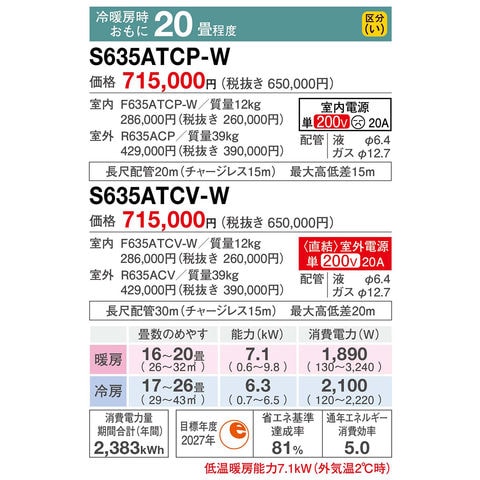 ダイキン エアコン CXシリーズ おもに20畳用/単相200V フィルター自動掃除 ストリーマ 2025年モデル 【配送のみ 設置なし 軒先渡し】 S635ATCP-W