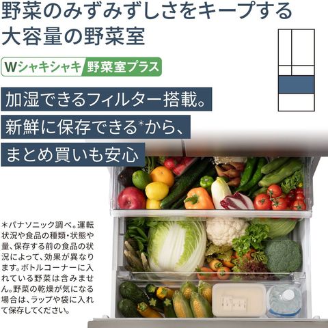 *1 Panasonic社調べ。運転状況や食品の種類・状態や量、保存する前の食品の状況によって、効果が異なります。ボトルコーナーは含みません。