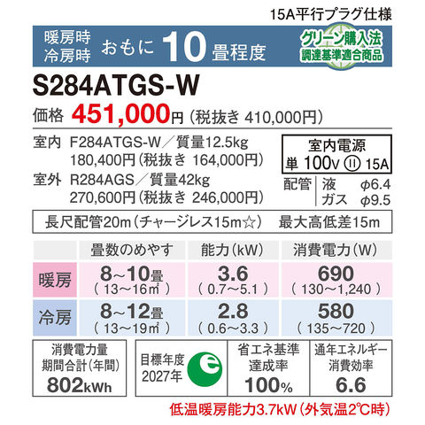 ダイキン エアコン GXシリーズ おもに10畳用/単相100V さらら除湿 フィルター自動お掃除 2024年モデル【大型商品(設置工事可)】 S284ATGS-W
