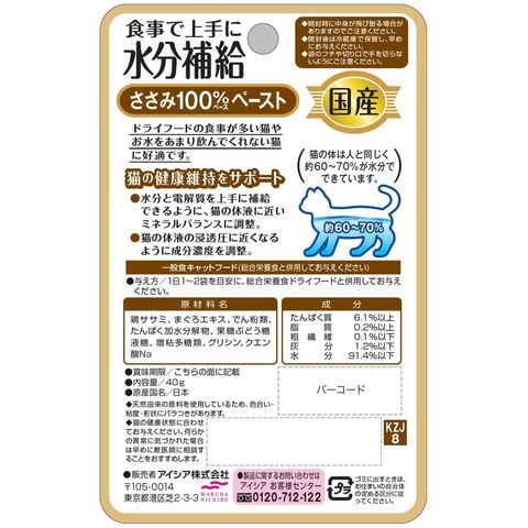 原材料:鶏ササミ、まぐろエキス、でん粉類、たんぱく加水分解物、果糖ぶどう糖液糖、増粘多糖類、グリシン、クエン酸Na