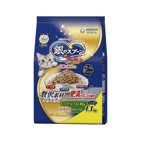 ユニチャーム 銀のスプーン贅沢素材肥満が気になる猫用まぐろかつおささみ野菜味に天然小魚かつお節まぐろ味フレーク添え1.1kg×6