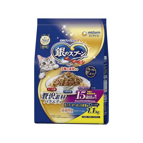 ユニチャーム 銀のスプーン贅沢素材腎臓の健康維持用15歳頃からまぐろかつお白身魚味にしらすかつおまぐろフレーク添え1.1kg×8
