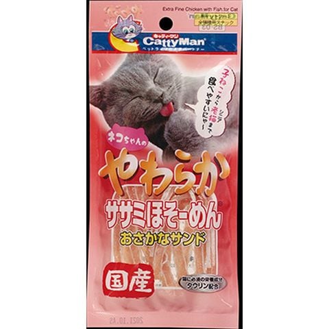 原材料:鶏ささみ、魚肉加工品、糖類、グリセリン、ソルビトール、酸化防止剤(エリソルビン酸Na、亜硫酸Na)、ミネラル類(ナトリウム)、リン酸塩(Na)、調味料、保存料(ソルビン酸カリウム)、タウリン、発色剤(亜硝酸ナトリウム)